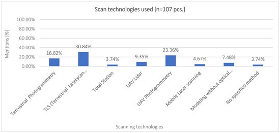 - (B) Modelling on the basis of photogrammetry:Another possible digital database is the use of photogrammetry. A total of 13 suitable items are identified in this category of the SLR for photogrammetric images, totaling 20.00% (13 of 65). These can also be differentiated into two different recording platforms—terrestrial scanning system and unmanned aerial vehicle (UAV or drone). The special feature of photogrammetry is the generation of a point cloud via the image recordings, the ‘image-based modelling (IBM)’ compared to the ‘range-based modelling (RBM)’ in category C of the analysis ‘Modelling on the basis of point clouds’. In the processing method, two-dimensional images are recorded using an optical, passive sensor [57]. Passive sensors use the light from the environment to capture the details of the environment in the form of images [105]. With the support of ‘Structure from Motion’ (SFM) and ‘Multi View Stereo’ (MVS) algorithms, 2D images can be automatically processed into 3D point clouds [57]. The photogrammetric 3D point cloud is further processed semi-automatically into a 3D model using artificial intelligence (AI) [52,55,56].WEI et al. analyse the existing literature to identify challenges for the use of photogrammetry in the context of BIM and Geographic Information System (GIS) of bridge structures. The generation of digital images of bridges is considered a further component of the work. It identifies 90 relevant scientific articles and derives 4 generally applicable challenges [60]. NETTIS et al. present a concrete procedure for the semi-automated modelling of BIM models of existing bridges. The photogrammetry data acquired with a UAV system serve as the basis for this. The data are analysed using AI algorithms so that a digital BrMo can be derived from a 3D point cloud based on photogrammetry. In another application scenario, this serves as the basis for inspections and seismic risk management [54]. Another method for creating 3D models of existing bridge structures using image data captured with a drone is described by PARK et al. The image data are then further processed into a semantically enriched BIM model using the so-called ‘Seismic for Structure’ approach and tested on a demonstrator [55].A further approach for generating a digital BrMo from photogrammetric images using the example of a historical arch bridge made of masonry is described by PEPE et al. The bridge is reconstructed as a digital image by AI-based evaluation of the recorded image data using ‘SFM’ and ‘MVS’ [56]. The use of AI for the automatic 3D reconstruction of bridge components from photogrammetric data is also investigated by MEHRANFAR et al. [52] In the modelling procedure, the captured image data are first processed into a photogrammetric 3D point cloud. This is then transferred to the orthogonal plane by reducing the points and 2D models of the building elements are derived. The final digital BrMo is created by merging the individual reconstructed digital bridge components. In this context, the components are linked on the basis of the horizontal and vertical curvatures of the bridge [52]. In addition, BARRILE et al. present a hybrid approach for the segmentation of photogrammetric 3D point clouds of existing bridges and their transformation into digital 3D models. Several systems based on machine learning methods including artificial neural networks (ANN) are used for both steps along the process chain and validated using a case study [49]. PEPE et al. combine UAV and terrestrial photogrammetry to record an ancient arched bridge. The images form the basis for a manual reconstruction of the structure into a 3D model [57]. WU et al. also present the procedure for generating a 3D model of a bridge including the surrounding harbour facilities using manual modelling with photogrammetry and 3D video fusion [61]. SAVINI et al. present various case studies focusing on the manual reconstruction of historical arch bridges made of masonry stones in Italy on the basis of terrestrial photogrammetry [59]. Furthermore, BORIN and CAVAZZINI investigate the use of photogrammetry for the manual creation of BrMo in the first step and the subsequent damage identification, localization and representation in the 3D model [50]. In the same subject area of damage measurements, POTENZA et al. use photogrammetric images from UAV systems in conjunction with mobile robotics for recording and subsequent further processing into a digital BrMo. This is then linked to a wireless sensor network and used for FEM simulations for damage prediction [58].