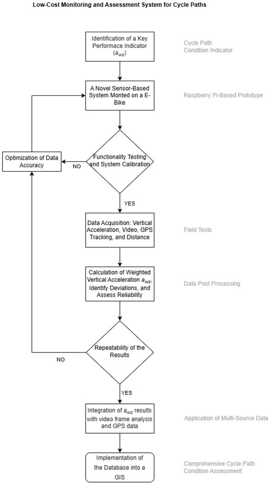 The main focus of this study is to propose an affordable, integrated methodology for monitoring and assessing cycle path conditions addressing the need for a reproducible, data-driven technique. Specifically, this approach contributes to optimizing maintenance, boosting cyclists’ safety and comfort, and ultimately encouraging the wider adoption of cycling in urban areas. Hence, a novel low-cost system—based on Raspberry Pi technology—has been developed to conduct surface condition assessments of cycle paths. The prototype integrates an Inertial Measurement Unit (IMU), a Global Navigation Satellite System (GNSS) receiver, a camera, and a magnetic sensor. The challenge and special features are to manage the data from various sensors, and then integrate and analyze different geospatial data on the pavement conditions of cycle networks. In more detail, the accelerometric data collected were evaluated with reference to whole-body vibration considering weighted vertical acceleration () according to the ISO 2631 standard [24]. This enabled the detailed comparison between the vibrations recorded and the pavement irregularities identified from frames captured simultaneously by the camera. Field tests were carried out on various sections of Rome’s bicycle network—differentiated by pavement type and maintenance conditions—by mounting the developed low-cost system on a bike to test its efficiency. Finally, the collected data were input into a Geographic Information System (GIS) to provide a tool capable of facilitating the analysis and mapping of bicycle lane conditions. Hence, the core contributions of this research are presented in Figure 1.