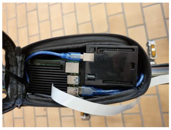 The CAMERA V3 STANDARD module [28] equipped with a Raspberry Pi (London, UK) Sony IMX708 12-megapixel image sensor was used for capturing high-resolution images of the cycle path surfaces. This camera module connects to Raspberry Pi via the CSI port, ensuring high-speed data transfer. It was mounted on the bicycle’s handlebars—as shown in Figure 4—angled downward to capture detailed images of the pavement’s surface conditions, including any irregularities or distresses.