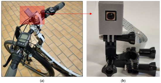 The imaging system. (a) The placement of the camera module on the handlebars; (b) a close-up view of the custom, 3D-printed mount designed to attach the module.