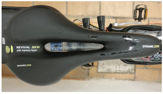 The IMU was securely fixed inside the bicycle saddle (Figure 5) to minimize external influences and ensure the accurate measurement of vertical vibrations, which are critical for assessing the quality of the cycle path.