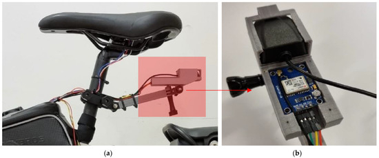 The GPS system. (a) The installation of the u-blox NEO-6M GPS module beneath the bicycle saddle; (b) a close-up view of the GPS module mounted on the custom, 3D-printed bracket.