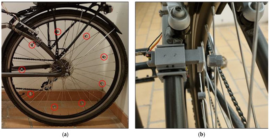 (a) The placement of the magnets on the spokes of the bicycle’s rear wheel for the Hall Effect sensor; (b) a close-up view of the Hall Effect sensor module mounted near the rear wheel, aligned to detect the passing magnets for accurate distance measurement.