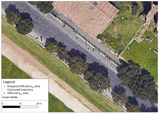 The trajectories of the cycle paths, derived from the Italian Regional Numerical Technical Map (Carta Tecnica Regionale Numerica, CTRN), were compared with the GPS coordinates, revealing discrepancies in areas with tree or building coverage. These differences are caused by Signal Multipath [38], a phenomenon whereby satellite signals are reflected off obstacles, thereby altering the accuracy of coordinates. To correct the misalignment, the “Snap Geometries to Vector” tool in QGIS [39,40] was used, which projects the GNSS coordinates onto the correct trajectory of the paths as defined by the CTRN (Figure 9). This approach enabled the creation of a dataset accurately reflecting the actual path travelled. The accuracy was further enhanced through the use of a magnetic odometer, which corrected any distortions in the overall length of the sections.