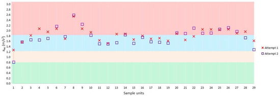 As an additional step to ensure the reliability of the monitoring system, a validation process was carried out on the cycle path adjacent to Circo Massimo, which served as a reference track. After initial measurement, a second test was conducted 30 min later to verify the consistency of the values. The results from the second measurement closely matched those of the first, demonstrating the system’s high stability (Figure 10). A numerical comparison between the two datasets revealed that in 74% of the cases, the calculated indices fell within the same interval, while in the remaining 26%, they were in adjacent intervals, with an average difference of just 0.25 m/s2.