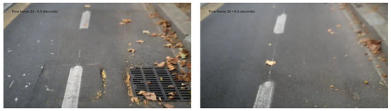 During the tests, the system recorded videos of the paved surfaces using a camera, allowing for the integration of visual data to enhance the interpretation of the results. At a speed of 15 km/h, the bicycle covered approximately 4.16 m per second. The camera was positioned to capture a longitudinal section of the road approximately 2.5 m in length (Figure 11). Based on the considerations, two frames per second were extracted from the video, ensuring continuous and slightly overlapping images along the entire investigated cycle path.