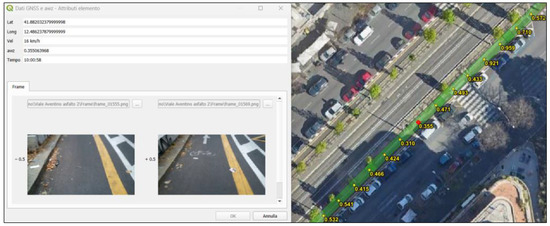 The main information, including the GPS coordinates, the values, and the representative video frames from each sample unit, was input into QGIS to create a comprehensive graphical representation of the investigated cycle paths (Figure 14). This integration provides managers with a quick and efficient tool to assess the overall condition of the cycle network.