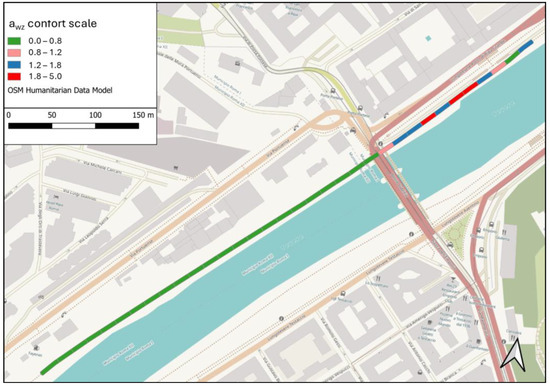 In addition to the ability to analyze specific data points, a comprehensive view of the examined cycle path was obtained using a predefined color scale (Figure 15), which is consistent with the comfort classes employed in this study. This color-coded representation provides an immediate visual indication of the overall condition of the infrastructure, facilitating the identification of areas that may require maintenance or further investigation.