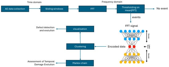 The methodology presented in this work introduces a novel approach to SHM by integrating frequency-domain analysis with deep learning techniques. By transforming AE signals from the time domain to the frequency domain using FFT, critical frequency components related to various damage types are revealed, enabling more accurate identification and tracking of damage evolution over time. The application of deep autoencoders for dimensionality reduction ensures that the high-dimensional data are effectively compressed while preserving essential information, facilitating the use of clustering techniques to categorize different damage states. This combination of FFT, autoencoder-based representation learning, and Markov chain analysis for temporal damage progression offers significant advancements over traditional SHM systems, allowing for early detection, precise damage classification, and predictive maintenance strategies that extend the lifespan of critical components.