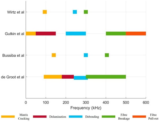 Matrix cracking has been assigned to the lower frequency range of 100–200 kHz. This extended range can be attributed to different directional behavior associated with matrix cracking within the samples tested, not only in relation to the fiber direction in relation to the individual laminates, which can give rise to both longitudinal and transverse matrix cracking. Also, the through-thickness matrix cracking, with cracks propagating perpendicular to the general plane of the material. The frequency ranges identified were observed across all samples tested, for both tensile and flexural testing. Hence, these frequency ranges can be employed for the evaluation of damage for materials tested. However, it is noted that the exact frequency range values are also material dependent, exemplified through extensive review [22]. Hence, this approach requires a given material to be characterized before further conclusions can be made regarding damage characterization, with the intended sensor also utilized. Despite the material-specific dependencies and other factors influencing the exact frequency values for damage, as well as the challenges in directly comparing with literature, the assigned values can still be evaluated in relation to established trends observed in similar materials and setups. To support this, a targeted literature review was conducted, focusing on studies with comparable experimental conditions. The corresponding values are presented in Figure 5, which illustrates variations in reported frequency bands for matrix cracking, delamination, debonding, fiber breakage, and fiber pull-out.