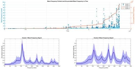 Figure 11 provides an in-depth analysis of frequency content and clustering results. The top plot illustrates the temporal progression of mean frequency content for two clusters, marked as Cluster 1 and Cluster 2. Over time, the accumulated mean frequency for both clusters grows steadily, with Cluster 2 showing a more rapid increase in frequency content after approximately 2 units of time. This suggests that Cluster 2 is likely capturing events or phenomena characterized by a higher frequency content, which may be indicative of more frequent or intense damage events compared to Cluster 1. The bottom plots from the previous figure display the frequency signatures for both clusters. By comparing these signatures with the damage type frequency ranges in Table 1, we can infer the possible damage modes associated with each cluster.