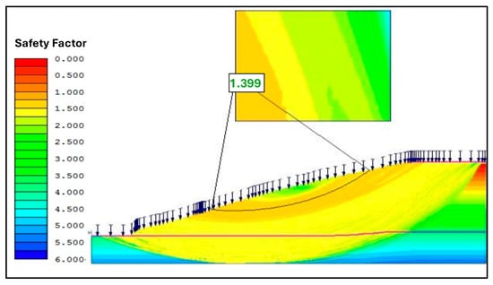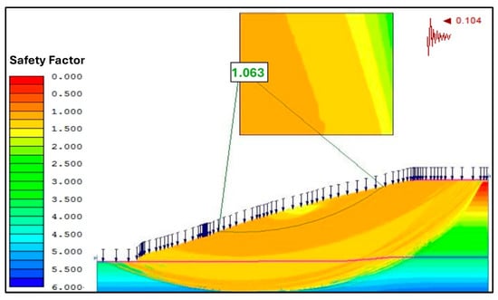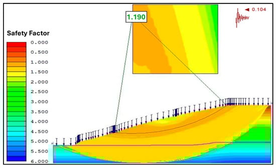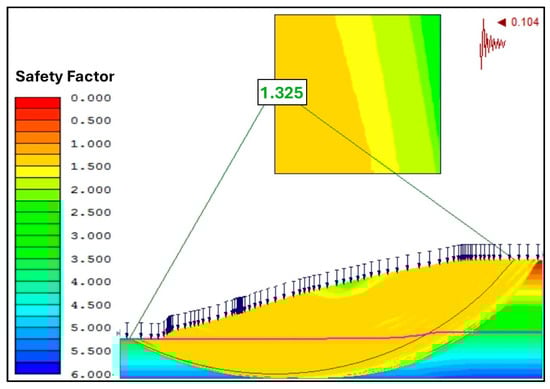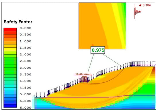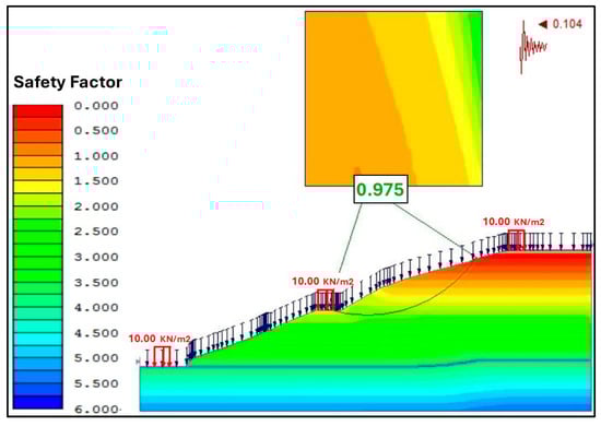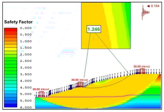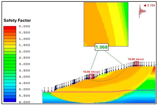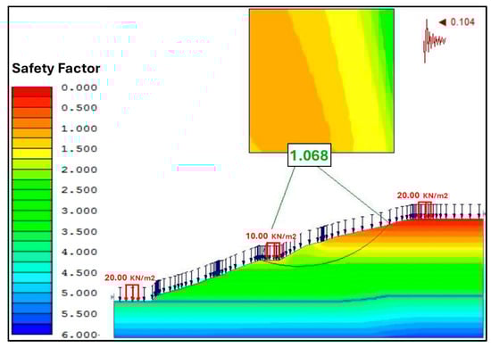 The FS under static conditions calculated on the natural slope (29°43′31.98″) suffered a decrease due to the load exerted. Initially, this slope registered a FS equal to 1.399. When applying a load of 10 KN/m2, it decreased by 3.46%; when applying a load of 20 KN/m2, it decreased by 5.36%; and finally, when applying a load of 30 KN/m2, it decreased by 5.90%, as shown in Figure 21.