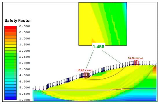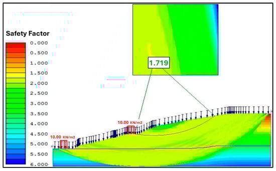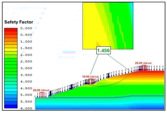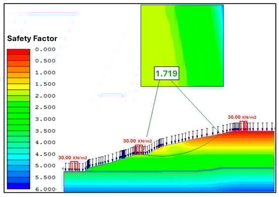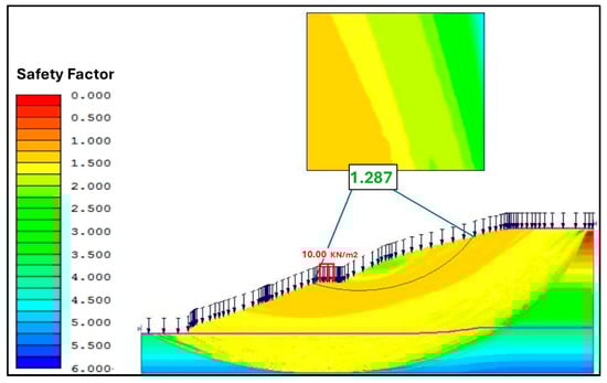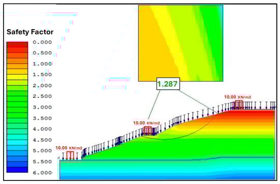 The stability analysis under static conditions of a slope 1 slope (27°43′31.98″) showed the decrease of the FS due to the load exerted. However, when considering a load of 10 KN/m2, it decreased by 4.34%; when applying a load of 20 KN/m2, it decreased by 6.72%; and finally, when applying a load of 30 KN/m2, it decreased by 7.43%, as shown in Figure 21.