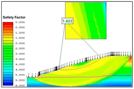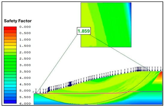 The FS in static conditions calculated for slope 2 (25°43′31.98″) suffered a decrease due to the load exerted. Initially, this slope registered a FS equal to 1.859. When applying a load of 10 KN/m2, it decreased by 3.11%; when applying a load of 20 KN/m2, it decreased by 4.89%; and finally, when applying a load of 30 KN/m2, it decreased by 5.55% (see Figure 21).