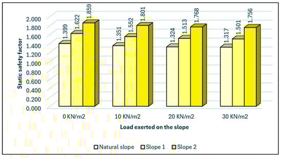 Variation in the static safety factor according to the applied load—natural slope, slope 1, and slope 2.