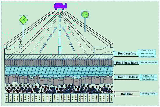 According to the theory of road construction, it was known that the layering of a road is from top to bottom: surface, base layer, sub-base, and road base. Each layer had different requirements for construction materials, and the road construction materials were adapted according to the nature of steel slag and modified steel slag, as shown in Figure 1.