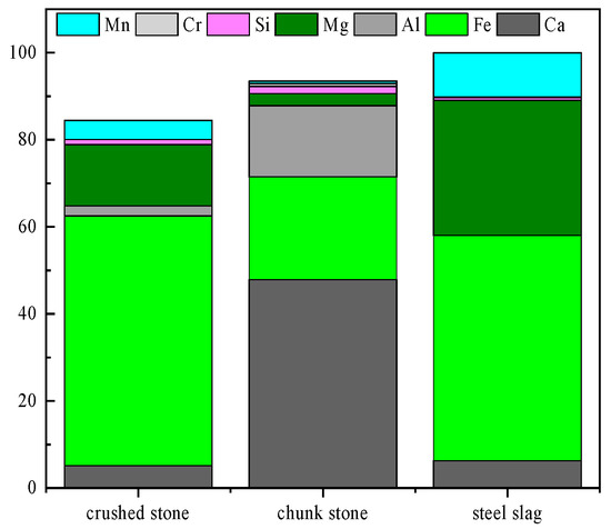 In road construction, aggregates are fundamental materials constituting the road structure, categorized based on their position and function within the road structure as surface aggregates and base and sub-base aggregates. Surface aggregates were employed in the top layer of the road, which is directly exposed to vehicular traffic, providing the necessary mechanical strength and stability to withstand the load of passing vehicles and daily traffic wear [23]. Consequently, surface aggregates needed to exhibit excellent abrasion resistance, skid resistance, and adhesion, which enhanced road durability and extended its service life, thereby reducing maintenance and repair frequency and ensuring driving safety while lowering long-term maintenance costs [24]. In contrast, base and sub-base aggregates were used in the lower layers of the road structure, including the foundation and sub-foundation layers [25]. These aggregates typically consisted of fine particles, designed to create a porous structure that allowed for water infiltration and drainage, reducing surface water and preventing damage from prolonged water exposure [26]. Additionally, fine aggregates could regulate the expansion and contraction of road materials under varying temperatures, minimizing temperature-induced cracking. Figure 2 presents the Energy Dispersive Spectroscopy (EDS) analysis of metals in typical road construction aggregates, including crushed stone [27], bulk stone [28], and typical steel slag [29]. Based on the metal content, it was concluded that the metal content of steel slag falls between that of crushed stone and bulk stone, indicating its potential as a road construction aggregate.