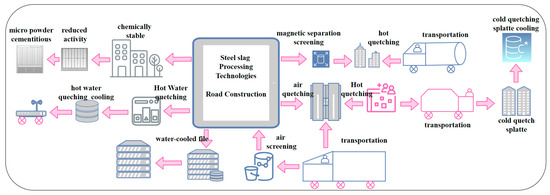 Figure 4 summarizes the processing techniques for steel slag application in road construction. The processing technologies for steel slag primarily include coarse and fine processing [35]. Coarse processing involves steps such as cooling, crushing, screening, and chemical stabilization. Fine processing includes the preparation of steel slag micro-powder and steel slag cementitious materials. The goal of coarse processing is to reduce the volume and render steel slag harmless, while simultaneously achieving resource utilization to a certain extent, balancing both economic and ecological benefits. Therefore, the steel slag treatment process should aim to be safe, reliable, simple, and environmentally friendly, providing the optimal treatment conditions for the carbonization of steel slag.