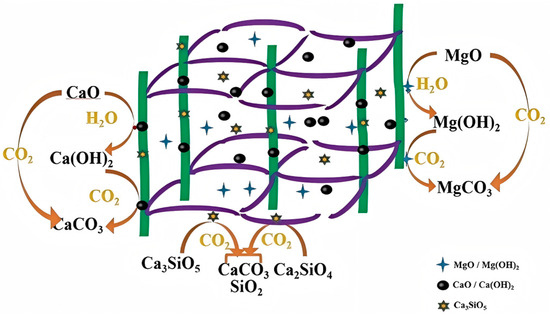 The composition analysis of steel slag revealed that the primary substances responsible for CO2 adsorption in steel slag are Ca, Mg, and Si compounds, with the carbonation reaction pathways outlined roughly in Figure 5. Under conditions with sufficient CO2, a small portion of CaO can directly react with CO2 to form CaCO3. The remaining CaO reacts with H2O to form Ca(OH)2, which then further reacts with CO2 to produce CaCO3, thereby completing the adsorption and sequestration of CO2. A small amount of MgO can directly combine with CO2 to form MgCO3. The majority of MgO reacts with H2O to form Mg(OH)2, which then fixes CO2. Under CO2-rich conditions, Ca3SiO5 and Ca2SiO4 can react to form SiO2 and CaCO3, thereby completing the CO2 absorption reaction [130].