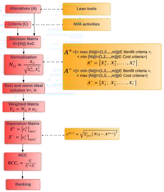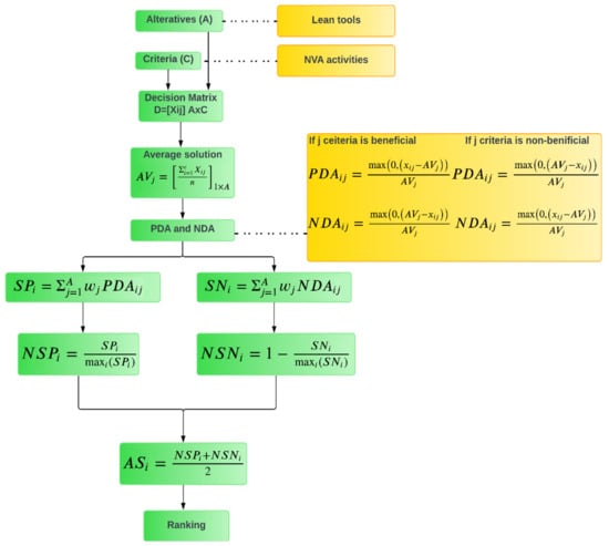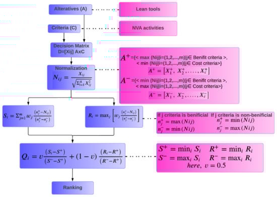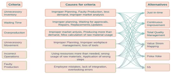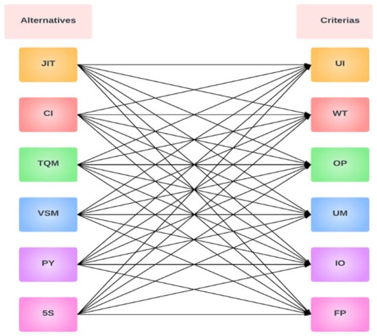 MCDM is a recognized branch within the broader field of operations research models, addressing decision-making challenges involving multiple criteria [,]. After establishing the relationship and assessing the amount to which the lean tools affect NVA activities, this study focuses on prioritizing the lean tools for adoption in the precast sector based on the criteria that are NVA activities. Numerous criteria should be taken into account, and changes that are made throughout the adoption process should not reduce final productivity. In the literature review, six alternatives, i.e., lean tools, along with six criteria, i.e., NVA activities as shown in Figure 3, are considered for MCDM analysis. This research integrates entropy and MCDM methods to rank the priority of lean tools for adoption in precast industry. To determine the importance of each criteria entropy, weights are calculated. Three MCDM, i.e., TOPSIS, EDAS, and VIKOR are utilized to rank the alternatives for lean implementation.