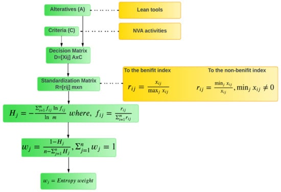 There are two types of weight calculations: subjective weight and objective weight. An expert’s judgment based on experiences and opinions renders the majority of the subjective weight, as with AHP and Delphi; using the entropy weight approach, the objective weight is determined directly from the actual data of the alternative. The entropy weight method’s benefit is a decrease in decision-makers’ subjective influence and an increase in objectivity. The Shannon entropy is often used in information theory to assess the degree of disorder and its applicability to system information. Entropy weight technique, one of the objective fixed-weight methods, bases its weight determination on the quantity of information [,]. The entropy weight () calculations based on Shannon’s theory are demonstrated in the below flow chart (Figure 4). If there are n NVA activities and m lean tools, then is the value of the jth index in the ith lean tool. Standardizing indexes utilizing the equations of relative optimal membership degree is important to remove the impact of index dimension upon incommensurability.