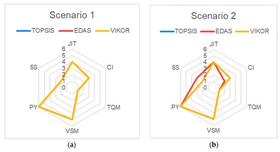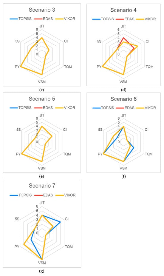 The radar graphic in Figure 8 clearly illustrates the ranking of lean tools and its differences determined by the MCDM approaches in different scenarios. There are five levels on each radar chart, with the outer layers scoring lowest and the interior layers highest. The dimensions in Scenario 1 weigh the same. The best choice is TQM, followed by 5S. In scenario 2, TQM is the optimal lean tool, followed by 5S, although there is not much of a difference between the two. Scenario 3 still places TQM first. Next is 5s with its respective waiting time, which is more weightage. In the overproduction perspective, TQM comes out on top of all MCDM approaches in Scenario 4, demonstrating its dependability. The last place on this list goes to PY, while according to Scenario 5, TQM and 5S retain their places. In Scenario 6, the rankings are little changed compared to other scenarios. In this, CI was in first place followed by TQM. The last scenario is same as Scenario 1 and Scenario 3. The outcomes of the six radar scenarios are biased in favor of TQM, with 5S coming in second. PY is the least biased. In conclusion, even if the rankings in the six scenarios change slightly, the overall outcomes seem to be the same as those obtained using the MCDM approaches.