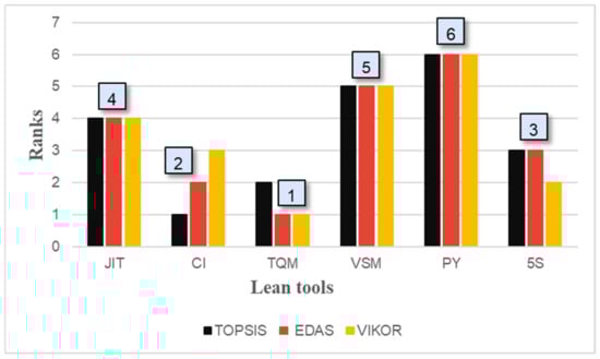 The lean tools are taken as alternatives, and NVA activities are taken as criteria. From the questionnaire, the data obtained represents the favorability of one particular lean tool to one criterion. Through MCDM analysis, the adaptability of lean tools can be known by considering all the criteria. The results of the three MCDM analysis are represented in the graph below as Figure 9. From this, TQM is ranked first in two methods, while CI is ranked first in one method. The three positions also alter between CI, TQM, and 5S. But the remaining ranks are constant; JIT occupies the fourth place, while VSM and PY follow, respectively.