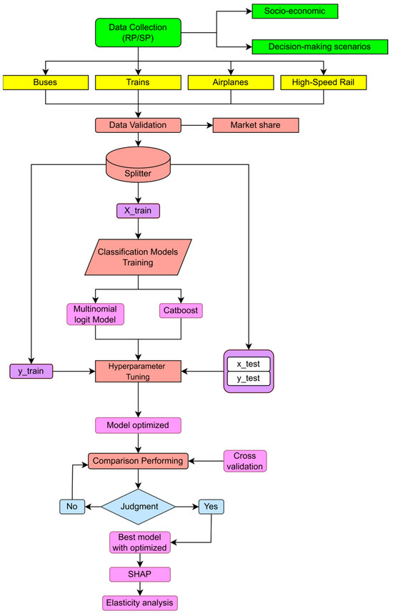 The market share analysis of transportation modes, including buses, trains, airplanes, and HSR, began with data collection through questionnaires simulating travel mode choices. Data validation ensured completeness, correctness, and balance, minimizing deviations among users of different travel modes. The data were processed and analyzed using Python 3.12.7 via Anaconda, requiring approximately two hours of final preparation. The analysis used an Intel Core i9-13900H processor (2.60 GHz, 13th Generation) and 32 GB RAM. Market share calculations evaluated the usage proportions of each mode, and the multinomial logit model predicted travel mode choices based on influencing factors. Machine learning techniques, especially CatBoost, were employed to enhance prediction accuracy and address overfitting. Hyperparameter tuning optimized the model, and cross-validation ensured reliability by testing on multiple data segments. SHAP (Shapley Additive Explanations) was used to analyze factor importance, identifying the positive and negative influences on passengers’ decisions. Finally, the elasticity analysis examined how changes in factors such as price or travel time affected market share, providing insights into traveler behavior. To ensure that the research results meet the required accuracy and performance criteria, a decision point was incorporated into the framework, allowing for model refinement through hyperparameter tuning and retraining if necessary. These results support the development of strategies and policies to improve transportation systems. Figure 2 illustrates the detailed conceptual framework.