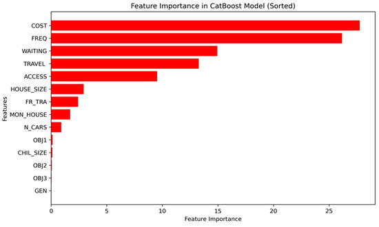 Among these, CatBoost proves particularly effective for predicting transportation mode choices, capturing nonlinear interactions between variables such as travel cost, time, convenience, and socio-demographic factors [46]. Its ability to process categorical data efficiently with minimal preprocessing makes it ideal for transportation analysis [32,58,59,60]. By accurately modeling complex travel behavior, these ensemble methods provide valuable insights for transportation planning and policy development.