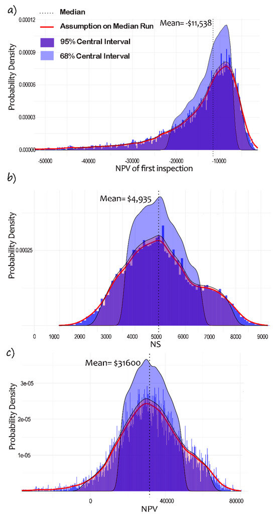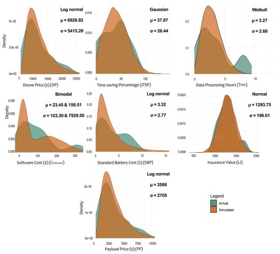 To strengthen the MCS, empirical distributions derived from actual data are compared to simulated distributions, ensuring accurate representation of stochastic variability. This enhances the reliability of the cost–benefit analysis for decision making. Figure 2 presents the results of the 10,000 MCS trials, displaying the mean, standard deviation (SD), and probability distribution type for each variable.