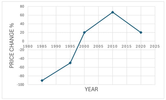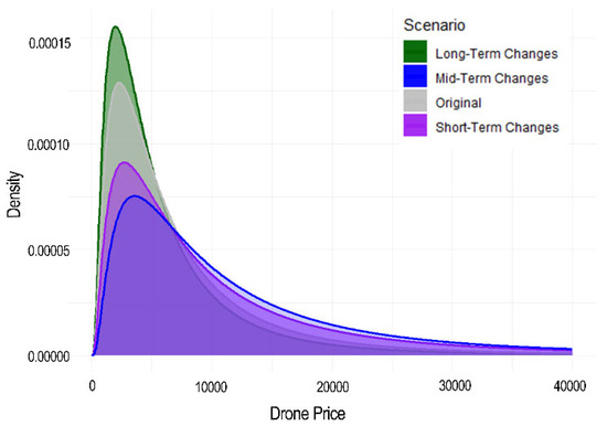In the midterm (2028–2033), further AI developments and automated fleet management are anticipated, boosting drone adoption for inspections and logistics. This study expects the consumer drone market to stabilize with standardized technology and pricing, leading to a +70% mean price change and a +10% variance. In the long term (2033+), universal regulations and advanced AI autonomy will enable complex operations and broader applications, with the market maturing into diverse offerings. Analysts forecast a mean price change of −20% and a variance of −5%. Figure 4 illustrates these trends, showing higher prices in the short term and midterm and balancing in the long term with stable, diverse options for varied needs.