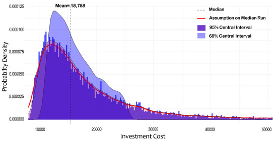 Here, represents the distribution of I, derived from 10,000 MCS. Figure 5 illustrates the empirical distribution of I, revealing a mean cost of USD 18,788.63, a median cost of USD 15,483.40, and a mode of approximately USD 8124.33. The standard deviation of USD 11,214.13 indicates significant cost variation, with half of the values between the 25th percentile (USD 12,272.6) and the 75th percentile (USD 21,362.03). The histogram displays 68% and 95% confidence intervals, highlighting likely cost boundaries. The right-skewed distribution suggests costs are more concentrated near the mode but with occasional spikes in the longer tail. Most costs fall below USD 30,000, aligning with the median and providing stakeholders with reliable cost expectations.