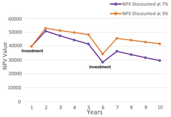Ten-year NPV projection comparing 3% and 7% discount rates.