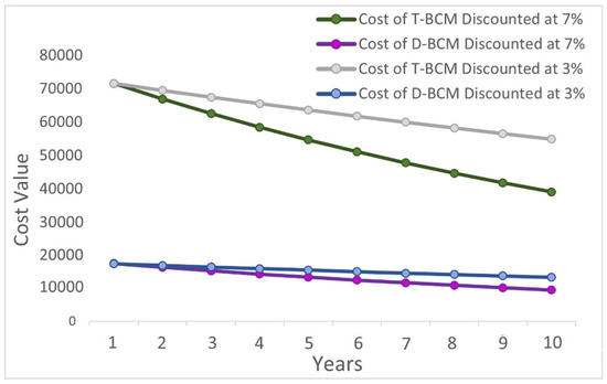 Comparative 10-year cost analysis of T-BCM and D-BCM at 3% and 7%.