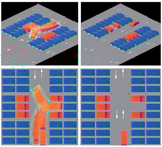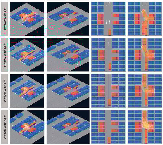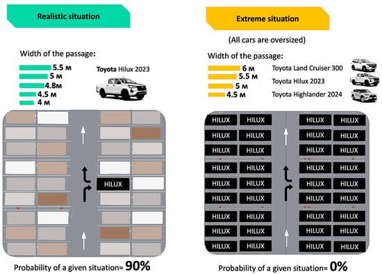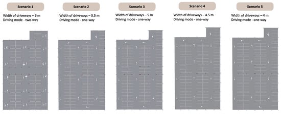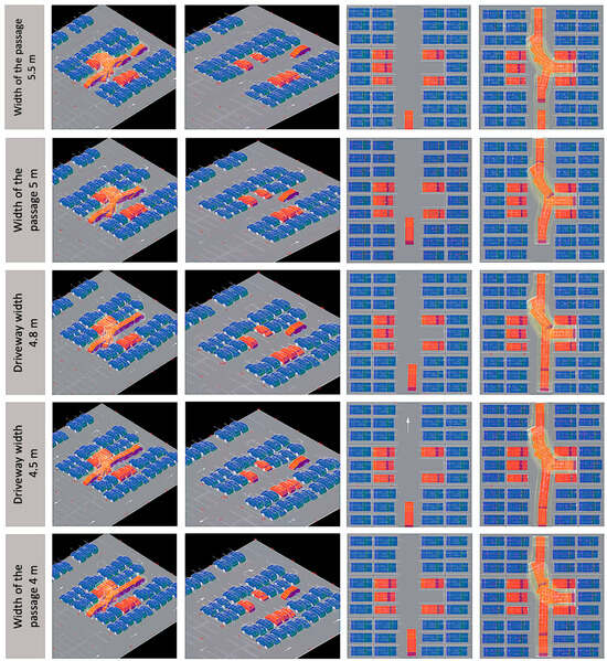 Table 1). Kazakhstan and the U.S. require 5.5–6.0 m, ensuring ample maneuverability but reducing capacity. European standards (5.0–5.5 m) align closely with this study’s findings. Some municipal codes allow widths as low as 4.5 m, which our results show is insufficient for larger vehicles. This study confirms that a 5.0–5.5-m range offers the best compromise between efficiency and usability, suggesting that some existing regulations are overly rigid or outdated.