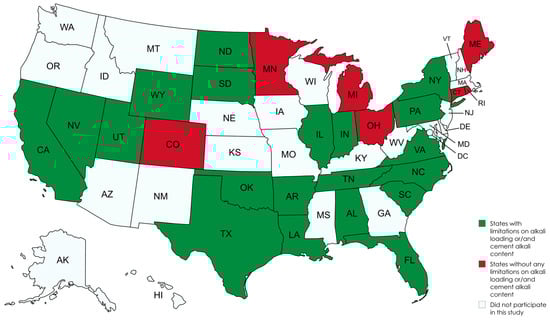| Alabama | Not significant | -Limestone and sandstone in the north and river gravel in the south. | -Cement alkali content limit: ≤0.6% Na2Oeq. -Concrete alkali loading limit: ≤2.4 Kg/m3 (4.00 lb/yd3). -Aggregate reactivity tests: None. -SCMs: Fly ash is primarily used. | -Satisfied with their outcomes. |