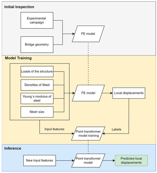 The proposed methodology is summarized in Figure 2. It begins with an initial inspection during which the data required to build the FE model is gathered. Next, the data generated by the FE model—providing high-fidelity displacement results under various loading conditions—serve as the ground truth for training a neural network. Once trained, the neural network uses the spatial features of the bridge geometry and the loading conditions as inputs to predict local displacements across the entire structure, offering a computationally efficient alternative to traditional FE model analysis.