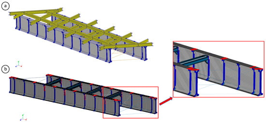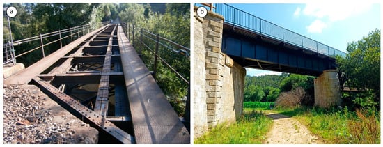For the implementation of the proposed methodology, a steel railway bridge located in Vilagarcía de Arousa—a region in the west of Galicia, Spain—was selected as a case study and it is shown in Figure 3. Constructed in 1897 by the English firm Joseph Westwood & Co., London, the Unitied Kingdom, the bridge was part of the railway line connecting Pontevedra and Vilagarcía de Arousa and remained operational until 2008. In 2020, it was renovated and later repurposed for pedestrian use. The structure, made of riveted steel, spans 15.6 m in length and 5.8 m in width and is supported by two masonry abutments. All steel components are fabricated from riveted steel plates and L-shaped profiles. The bridge’s structural composition includes two principal girders (each 1.57 m in height with flanges 0.38 m wide) interconnected by four cross-girders. Lateral reinforcement of the main girders is provided by twenty-six web stiffeners and thirty-one L-shaped bracings, while a frame consisting of two longitudinal and seven transverse beams rests atop the main and cross-girders to facilitate load distribution.