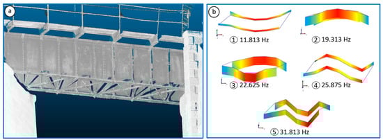 Main results of the experimental campaign: (a) point cloud of the bridge, (b) vibration modes and natural frequencies.
