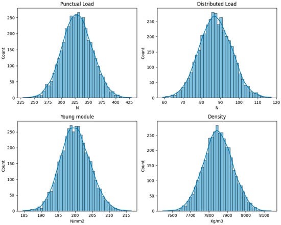 Histogram of the input parameters, point load, distributed load, Young’s modulus, and density, showing their respective ranges and frequencies.