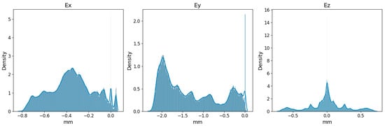 Histogram of the output parameters, displacements in each axis, showing their density distributions.