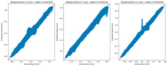 Scatter plots comparing the model’s predicted displacements (vertical axis) with actual values (horizontal axis) along the X, Y, and Z axes. Perfect agreement would lie on the red diagonal.