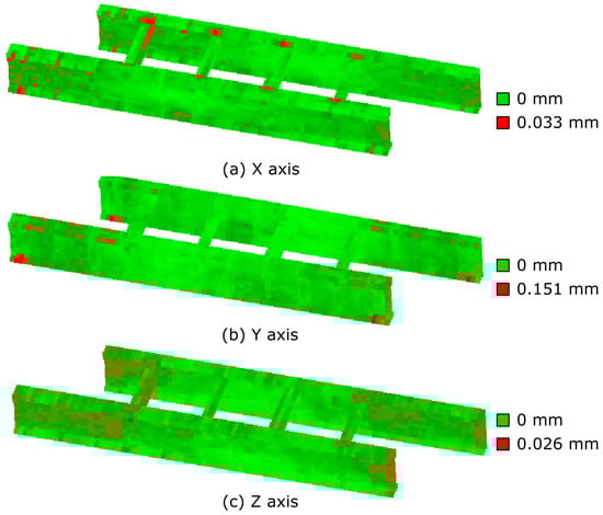 Mean absolute errors mapped onto 0.1 m voxels of the 3D bridge model, highlighting zones of higher (red) and lower (green) error along each axis. This voxel-based visualization helps pinpoint regions where the model struggles most.