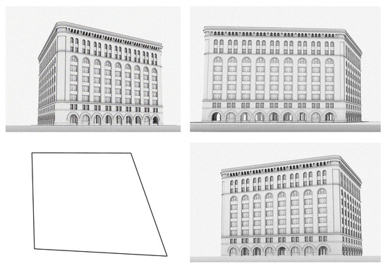 To examine the epistemological implications of parametric analysis, this article focuses on a case study of the Federal Archive Building in New York City [23]. The building is a typical nineteenth-century warehouse–office hybrid in a dense urban location. Its design reflects broader historical patterns in its North American context. Its multi-story, grid-based structure is typical of many contemporary buildings with similar functions. From the point of view of digital modeling, the Federal Archive Building presents a unique challenge, which is that despite its overall symmetrical and rectangular appearance, it is constructed on an irregular polygon base. This irregularity is immediately apparent in a map or plan view, and less so in ground-level perspective views (Figure 1). By comparing a direct model of the building with a parametric model that encodes variable conditions, this study explores how digital modeling techniques may influence the interpretation of architectural form.