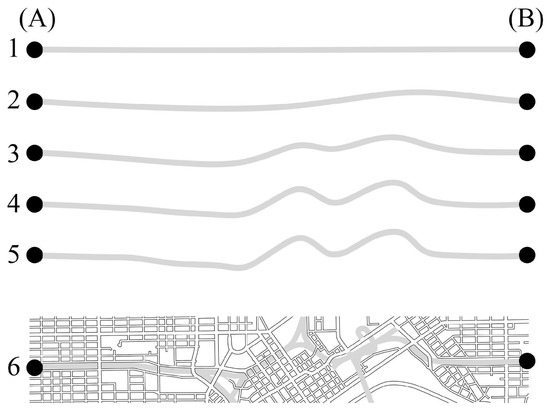 Rows (1–6) illustrate a series of maps showing the route of an urban freeway connecting endpoints (A) and (B). Row (1) proposes an initial visual hypothesis, namely, that the freeway may be represented as a simple straight-line route connecting the two endpoints. Each successive row in the figure introduces distortions to this idealized route, progressively approximating the spatial constraints and conditions that are measurably present in the city, until row (6), which constitutes a detailed and relatively accurate map of the freeway in its urban context. Critically, the intermediate maps in rows (2) through (5) function as something more than static representations of the freeway’s geographic reality. In fact, the maps, considered collectively, enable inferences about urban-scale forces that might influence the freeway’s trajectory. These forces—whether topographical, infrastructural, social, or economic—may be inferred from the visible distortions observed in each successive intermediate map.