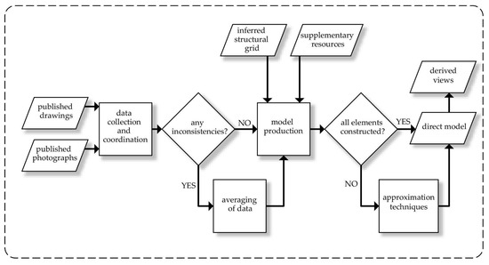 The first methodological component was to construct a direct model of the subject building on the basis of collected data (Figure 3). Published drawings of the subject building were collected, inconsistencies (if any) were identified, and additional inferred and supplementary resources were brought to bear. Approximation techniques were used as necessary to complete the model.