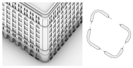 In general, the building’s exterior wall consists of a solid masonry enclosure, thickest at the base and decreasing in thickness at the upper floor levels. The masonry enclosure is punctuated by a regularly repeating vertical bay of windows, organized vertically. Due to the building’s non-rectangular base, this motif is repeated a different number of times on each of the building’s four elevations. The exterior surface of the enclosure is generally flat, except at locations where it is bounded by horizontal cornices (e.g., at the top and at the base). These cornices were modeled as horizontal extrusions along the surfaces of the four walls. Where necessary, supplementary resources (e.g., contemporary photographs) were consulted to aid in decision-making. In any specific situations where the collected data were insufficient for modeling, approximation techniques were used to achieve the best conformance with the published documentation and supplementary resources.