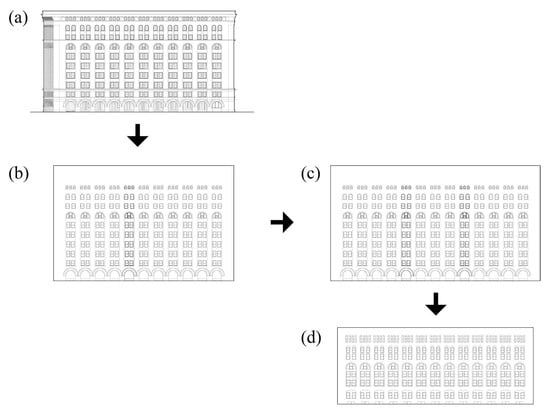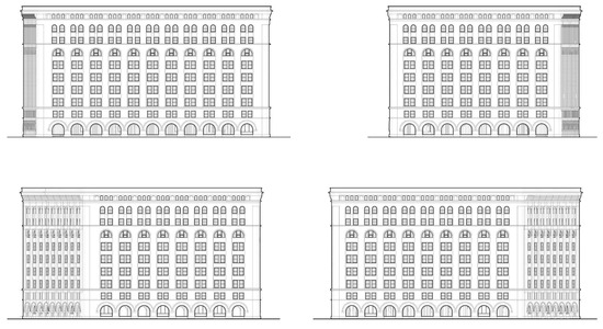 Second, parametric modeling has unique characteristics as a knowledge-generating activity, deriving from its capacity for dynamic iteration. While maintaining topological connections to the target building, parametric models can generate multiple variations, exploring the building’s underlying conceptual frameworks. This iterative capacity allows researchers to investigate how different geometric configurations might affect a building’s visual expression, even as core design relationships are preserved. The ability to systematically generate multiple iterations for analysis distinguishes this approach from traditional documentation-based methods. As an example, parametric analysis offers potential for transferring insights between buildings across different contexts. Figure 14 visually juxtaposes a geometrically accurate elevation of the Federal Archive Building (a) with a parametrically modeled elevation (b), a hypothesized extended version of that elevation (c), and a similarly detailed but geometrically accurate elevation of the now-demolished Marshall Field Wholesale Store in Chicago (d).
