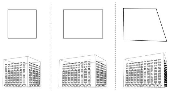 Using this method, it was possible to generate multiple modeled iterations representing the Federal Archive Building. As the locations of the corner points were changed in real time, the model updated its configuration, mapping window bays appropriately to the modeled facades. In particular, the model may be configured on a square base (Figure 13, left), it may be rectangularly distorted (Figure 13, center), or the base may be distorted into a general quadrilateral (Figure 13, right).