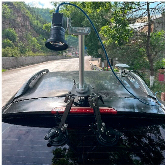 A dedicated hard drive support and fixation bracket was designed, featuring a tripod with suction cups for stability. The industrial camera and high-resolution lens are screw-mounted onto the bracket, which is securely positioned in a triangular configuration at the rear of the vehicle (as shown in Figure 5). A balancing mechanism is incorporated between the camera and the mounting structure, enabling the camera to capture pavement images at a fixed angle relative to the vertical axis, ensuring optimal image acquisition.